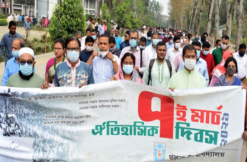 শিক্ষক সমিতির সভাপতি প্রফেসর ড. মোঃ ওয়ালিউল হাসানাতের সভাপতিত্বে আলোচনা সভায় প্রধান অতিথির বক্তৃতা করেন উপাচার্যের রুটিন দায়িত্বে নিয়োজিত উপ-উপাচার্য প্রফেসর ড. মোসাম্মাৎ হোসনে আরা। তিনি বলেন, বাঙালির হাজার বছরের স্বপ্ন, আকাঙ্খা, স্বাধীনতা এই তিনটি বিষয় একসূত্রে গেঁথেছে এই মার্চ মাস। স্বাধীনতার স্বপ্নের ইতিহাস বহন করেছে ৭ই মার্চ। বাঙালির স্বপ্নকে দৃঢ় সংকল্পের মাধ্যমে জাতিকে ঐক্যবদ্ধ করে তার সকল প্রয়াস ও স্বার্থক করতে নেতৃত্ব দিয়েছেন বঙ্গবন্ধু শেখ মুজিবুর রহমান। ৭ মার্চের ঐতিহাসিক ভাষণের শব্দ ও বাক্যের শক্তি এতোটাই তীব্র যা মুক্তিযুদ্ধ থেকে জনযুদ্ধে রূপান্তরিত করে। ৭ই মার্চের ভাষণে একদিকে সাবলিল, অনির্বাণ উদীপ্ত বারুদ ছিলো, আবার অন্যদিকে বন্দুকের নল, কামানের তাক ছিলো, আকাশে হেলিকপ্টারে চক্রও ছিলো। সেদিন স্বাধীনতার ঘোষণা করলে কী ভয়াবহ পরিণতি হতো তা বঙ্গবন্ধুর জানা ছিলো। তাঁর বিরুদ্ধে বিচ্ছিন্নতাবাদীদের নেতা ও অভ্যুত্থানের অভিযোগ আনা হতো। তাই বঙ্গবন্ধু ৭ই মার্চের ভাষণে যথার্থই মেধা, প্রজ্ঞা, বিচক্ষণতা, দূরদর্শীতা ও সুকৌশলের পরিচয় দিয়েছিলেন। তিনি স্বাধীনতা ও মুক্তিযুদ্ধের লক্ষ্যে সকল দ্বিধা-দ্বন্দ্ব ঘুঁচিয়ে বাঙালি জাতিকে ঐক্যবদ্ধ করার মন্ত্রে উজ্জীবিত করেছিলেন। এ কারণে বঙ্গবন্ধুর ভাষণের পরপরই তাঁর আহ্বানে সাড়া দিয়ে ঘরে ঘরে দুর্গ গড়ে তোলে মুক্তিকামী মানুষ। বঙ্গবন্ধুর ৭ই মার্চের ঐতিহাসিক ভাষণ বাঙালি জাতির চিরকালীন প্রেরণার উৎস। আজ বঙ্গবন্ধুর স্বপ্নের সেই জায়গায় দেশকে পৌঁছে দিয়েছেন তারই সুযোগ্য কন্যা প্রধানমন্ত্রী শেখ হাসিনা। তাঁরই নেতৃত্বে মুক্তিযুদ্ধের স্বপ্ন বাস্তবায়িত হচ্ছে। দেশ এগিয়ে যাচ্ছে। দেশের সার্থক নেতৃত্ব দেওয়ায় তিনি আন্তর্জাতিক ক্ষেত্রে একের পর এক পুরষ্কার ও অভিধায় ভূষিত হচ্ছেন।