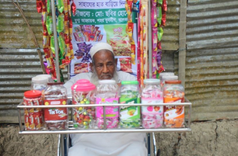 ঝালকাঠি শহরতলীর বাসন্ডা এলাকার ৯০ বছরের বৃদ্ধ আব্দুল হক তালুকদার। ১৪ বছর আগে পড়ে গিয়ে পায়ে আঘাত পেয়ে প্রতিবন্ধীতা বরণ করেন আব্দুল হক। চরম দারিদ্রের সংসারে জীবনযাপন দায় হয়ে পড়ে এ বৃদ্ধের। স্থানীয়দের মাধ্যমে বিষয়টি জানতে পেরে এগিয়ে আসেন ঝালকাঠির যুবলীগ নেতা ছবির হোসেন। মঙ্গলবার (৯ মার্চ ) সকালে একটি হুইল চেয়ার নিয়ে প্রতিবন্ধী বৃদ্ধের বাড়িতে হাজির হন ছবির হোসেন। ওয়ার্কসপ থেকে বিশেষভাবে সংযুক্ত করা হয় ভ্রাম্যমান দোকানের কাঠামো। আর তাতে বিভিন্ন ধরণের শিশু খাদ্য সাজিয়ে বৃদ্ধকে বসিয়ে দেয়া হয় হুইল চেয়ারে।