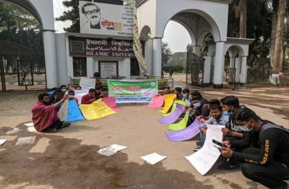 রোববার (২১ মার্চ) সকাল দশটায় বিশ্ববিদ্যালয়ের প্রশাসনিক ভবনের সামনে তারা এ কর্মসূচী পালন করেন। বাংলা ও সমাজকর্ম বিভাগের কয়েকজন শিক্ষক-শিক্ষার্থী এ কর্মূসচীতে অংশ নেন।