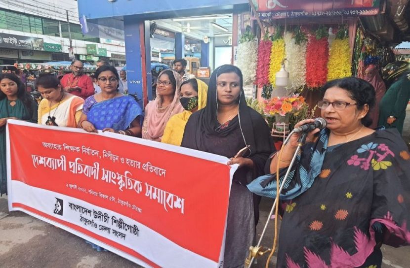 নিজস্ব প্রতিনিধি, ঠাকুরগাঁও : সারাদেশে অব্যাহত শিক্ষক নির্যাতন,নিপীড়ন ও হত্যার প্রতিবাদে ঠাকুরগাঁওয়ে প্রতিবাদী সাংস্কৃতিক সমাবেশ অনুষ্ঠিত হয়েছে।