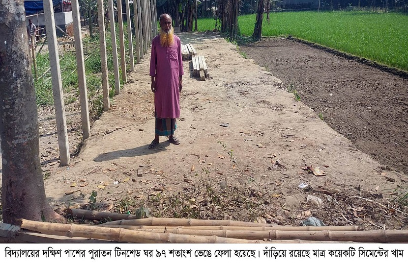 রবিবার (৫ মার্চ) সকালে ওই বিদ্যালয়ে সরেজমিনে গিয়ে দেখা যায়, বিদ্যালয়ের দক্ষিন পাশে একটি পুরাতন টিনশেড ঘরছিল। যা ৯৫ শতাংশ ভেঙ্গে ফেলা হয়েছে দাঁড়িয়ে রয়েছে মাত্র কয়েকটি সিমেন্টের খাম। টিনশেড ঘরের স্থাপনাগুলো অর্ধেক সাবেক সভাপতির বাড়িতে আর বাকী অংশ বিদ্যালয়ের পশ্চিম দিকে নতুন ভবনের পাশে রাখা হয়েছে।