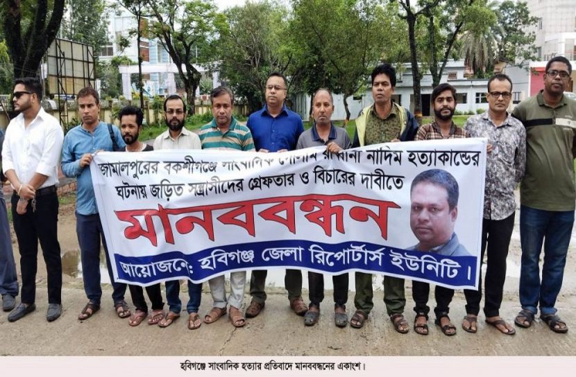 ফয়সল চৌধুরী, হবিগঞ্জ: জামালপুরে বাংলানিউজের সাংবাদিক গোলাম রব্বানী নাদিম হত্যার ‘সঠিক তদন্ত ও সুষ্ঠু বিচার’ দাবিতে হবিগঞ্জে মানববন্ধন অনুষ্ঠিত হয়েছে। রোববার (১৮ জুন) দুপুরে জেলা প্রশাসকের কার্যালয়ের সামনে হবিগঞ্জ রিপোর্টার্স ইউনিটে এ মানববন্ধনের আয়োজন করে।