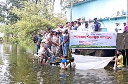 এ সময় পাগলা নদী, উপজেলা পরিষদ পুকুর, তোহখানা পুকুর, রাজারবাগান পুকুর ও রানী বাড়ি গুচ্ছগ্রাম পুকুরে ২১০ কেজি রুই, ১২০ কেজি মৃগেল ও ৮০ কেজি কাতলা পোনামাছ অবমুক্তকরণ করা হয়।