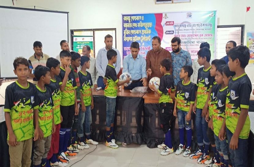 সংবর্ধনা অনুষ্ঠানের শুরুতেই বিজয়ী বিদ্যালয়ের প্রধান শিক্ষক দুলাল চন্দ্র হাওলাদার ও জেলা চ্যাম্পিয়ান ফুটবল দলকে ফুলের তোড়া দিয়ে বরণ করে নেন অতিথিবৃন্দ। একই সাথে বিজয়ী খেলোয়ারদের মাঝে ফুটবল, জার্সি, বুটসহ নানা ক্রীড়াসামগ্রী উপহার দেন।