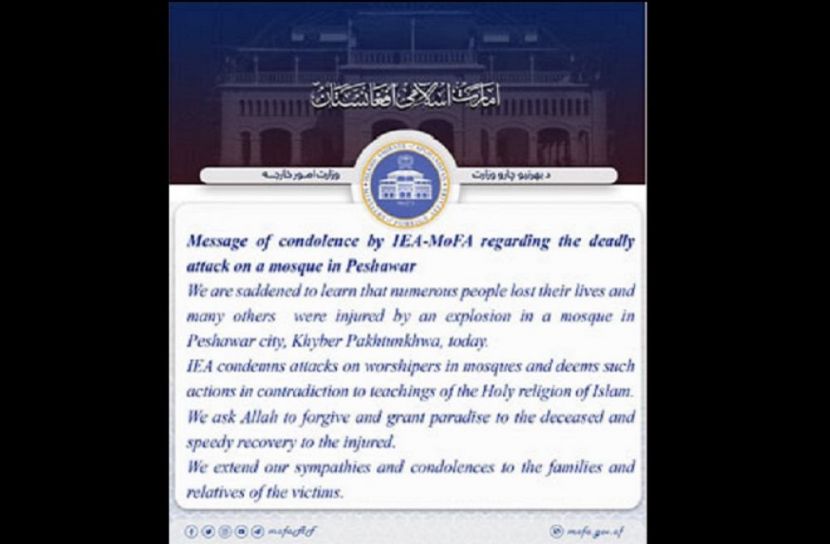 বিবৃতিতে বলা হয়েছে, ‘পাকিস্তানের খাইবার পাখতুনখোয়ার পেশোয়ার শহরের একটি মসজিদে বিস্ফোরণের ঘটনায় বহু মানুষের প্রাণহানি ও আহতের ঘটনায় আমরা গভীরভাবে দুঃখ প্রকাশ করছি। ইমারাতে ইসলামীয়া আফগানিস্তান মসজিদে মুসল্লিদের ওপর হামলার নিন্দা করে।