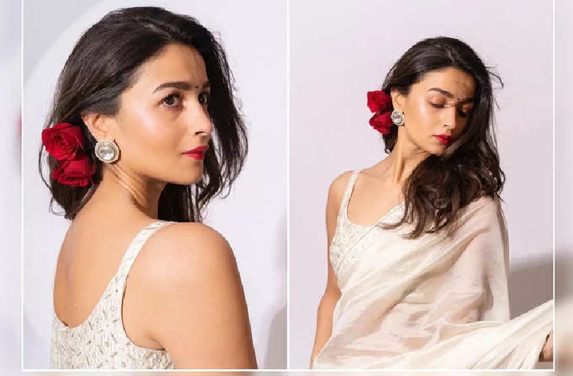 ফুলেল প্রিন্টের ব্লাউজের সঙ্গে তাকে দেখাচ্ছিলো অসাধারণ। কপালে টিপ ও কানে সাদা মেটালের এক জোড়া দুল, এতেই অসামান্য লাগছিলো আলিয়াকে। চুলের খোঁপায় লাগানো ছিলো সাদা গোলাপ।