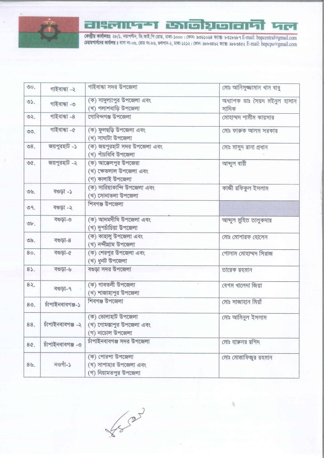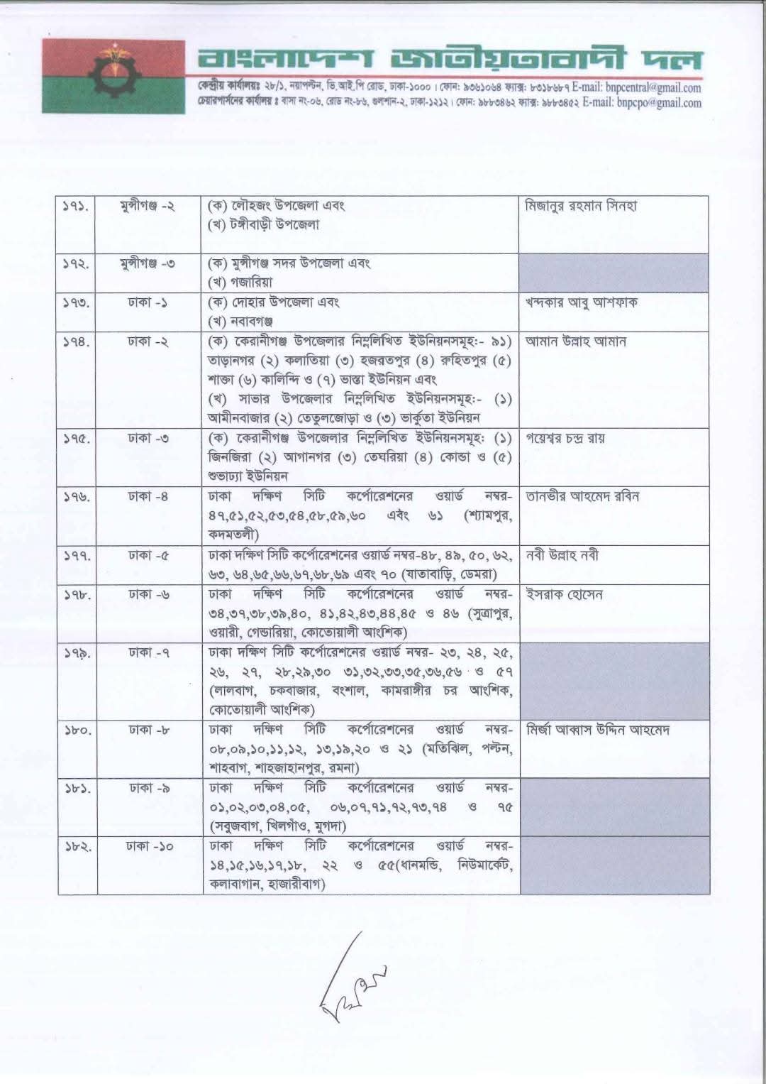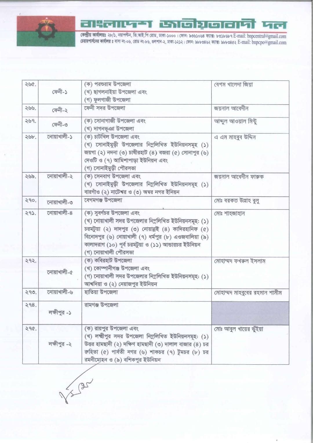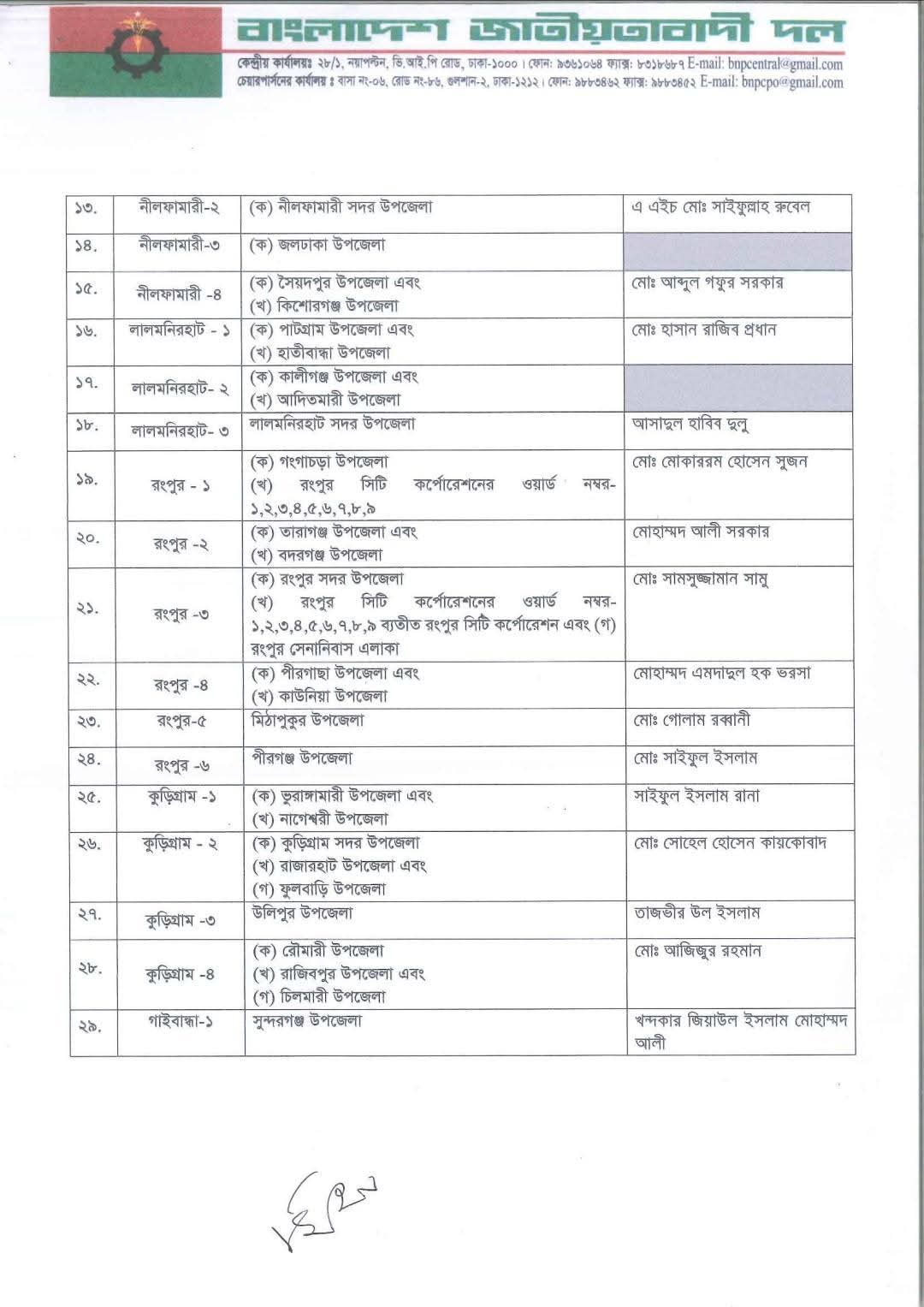 বিএনপি চেয়ারপারসন খালেদা জিয়া বগুড়া-৭, দিনাজপুর-৩ ও ফেনী-১ আসনে প্রতিদ্বন্দ্বিতা করবেন। দলটির ভারপ্রাপ্ত চেয়ারম্যান তারেক রহমান বগুড়া-৬ আসন থেকে নির্বাচনে অংশ নেবেন। মির্জা ফখরুল ঠাকুরগাঁও-১ আসন থেকে নির্বাচনে প্রতিদ্বন্দ্বিতা করবেন।