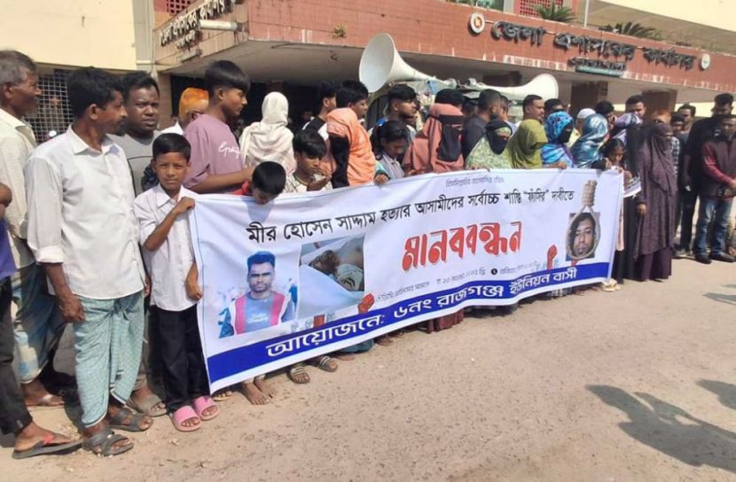 নোয়াখালীর বেগমগঞ্জ উপজেলার রাজগঞ্জ ইউনিয়ন ছাত্রদল নেতা মীর হোসেন সাদ্দাম-এর হত্যাকারীদের আইনের আওতায় এনে শাস্তি নিশ্চিতের দাবিতে নোয়াখালী জেলা প্রশাসক কার্যালয়ের সামনে মানববন্ধন করেছে নিহত সাদ্দামের পরিবার, স্বজন ও এলাকাবাসী।