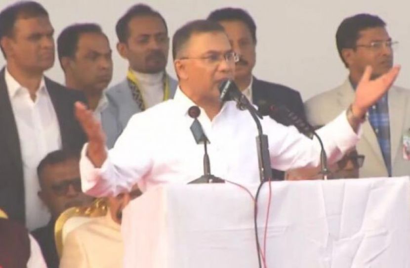 মঞ্চে তারেক রহমানকে স্বাগত জানান বিএনপির মহাসচিব মির্জা ফখরুল ইসলাম আলমগীর।
