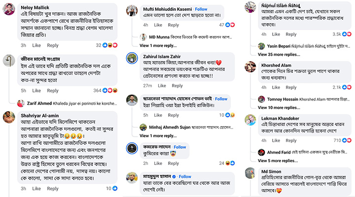 তবে বাংলাদেশের রাজনীতিতে দেখা গেছে এক ভিন্ন চিত্র। খালেদা জিয়ার মৃত্যুর খবর ছড়িয়ে পড়ার পর কার্যক্রম নিষিদ্ধ সংগঠন বাংলাদেশ আওয়ামী লীগের ফেসবুক পেজ থেকে একটি শোকবার্তা পোস্ট করা হয়। একই সঙ্গে জুলাই গণঅভ্যুত্থানে ক্ষমতাচ্যুত সাবেক প্রধানমন্ত্রী শেখ হাসিনার পুত্র সজীব ওয়াজেদ জয়ের ফেসবুক অ্যাকাউন্ট থেকেও খালেদা জিয়ার মৃত্যুতে শোক প্রকাশ করে একটি পোস্ট দেওয়া হয়।