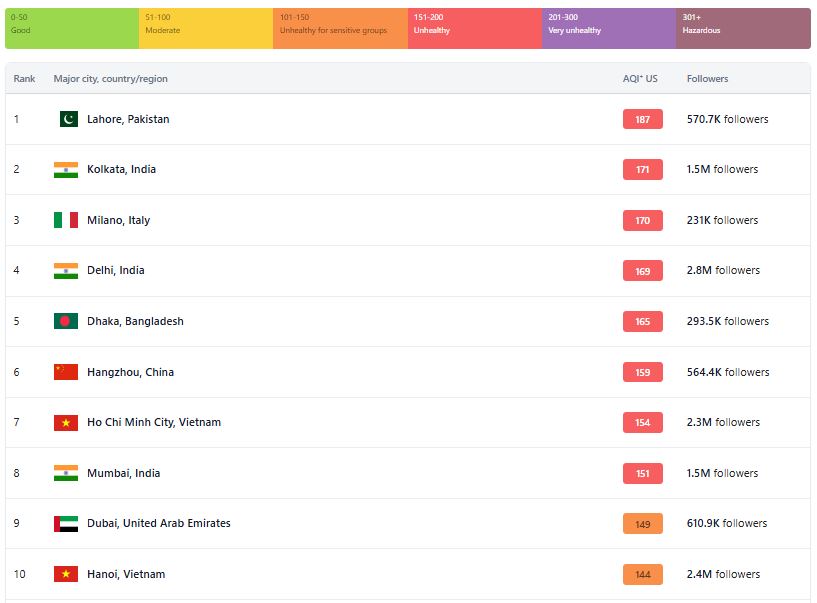 সুইজারল্যান্ডভিত্তিক পরিবেশগত গবেষণা প্রতিষ্ঠান আইকিউএয়ার (IQAir)-এর ১২ অক্টোবর (রোববার) সকাল সাড়ে ৯টাই প্রকাশিত তথ্য অনুযায়ী পাকিস্তানের লাহোর শহর আবারও বিশ্বের সবচেয়ে দূষিত বাতাসের শহর হিসেবে উঠে এসেছে। লাহোরে বাতাসের মান (AQI) ছিল ১৮৭, যা ‘অত্যন্ত অস্বাস্থ্যকর’ হিসেবে চিহ্নিত।