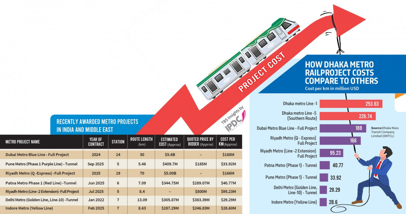 ঢাকার মেট্রোরেল নির্মাণ ব্যয় ভারতের পাটনা, পুনে ও ইন্দোরের তুলনায় প্রায় পাঁচগুণ বেশি। ঢাকা ম্যাস ট্রানজিট কোম্পানি লিমিটেডের (ডিএমটিসিএল) সাম্প্রতিক পর্যালোচনায় দেখা গেছে, ঢাকায় প্রতি কিলোমিটারের খরচ ২২৬.৭৪ থেকে ২৫৩.৬৩ মিলিয়ন ডলার, যেখানে ভারতের পাটনাতে তা মাত্র ৪০.৭৭ মিলিয়ন ডলার। এছাড়া সৌদি আরব ও সংযুক্ত আরব আমিরাতের ব্যয়ও ঢাকার তুলনায় কম।