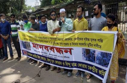 শুক্রবার (১ অক্টোবর) জাতীয় প্রেসক্লাবের সামনে মানববন্ধন করে বিভিন্ন দাবি তুলে ধরেন ‘নদী ভাঙলে জমি খাস আইন বাতিল সংগ্রাম কমিটি'। সংগঠনটি নদীর সিকস্তি অঞ্চলে ডিএস, সিএস, এসএ ও আরএস রেকর্ড, চিটার ভলিউম দেখে প্রজাস্বত্ব বহাল ও খাজনা-খারিজ চালুসহ ৭ দফা দাবি বাস্তবায়নের কথা বলেন।