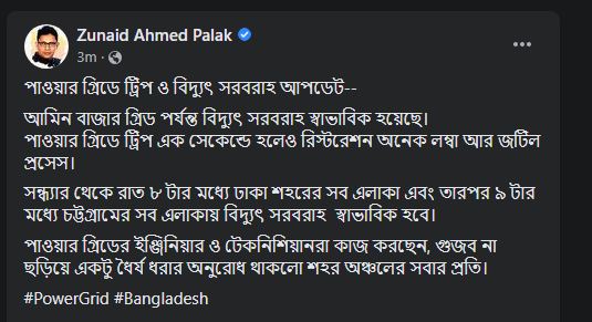 এ দিকে তথ্য ও যোগাযোগ প্রযুক্তি বিভাগের প্রতিমন্ত্রী জুনাইদ আহ্মেদ পলক তার জনপ্রিয় সামাজিক মাধ্যম ফেসবুকে এক পোস্ট এ তিনি বলেন 'পাওয়ার গ্রিডে ট্রিপ ও বিদ্যুৎ সরবরাহ আপডেট-- আমিন বাজার গ্রিড পর্যন্ত বিদ্যুৎ সরবরাহ স্বাভাবিক হয়েছে।