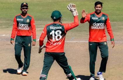 এরপর নুরুল হাসান সোহানও উইকেটে টিকতে পারেননি। অ্যান্ড্রু টাইয়ের এক ডেলিভারি অনেকটা সামনে এগিয়ে গিয়ে ওয়াইডের কাছাকাছি জায়গা থেকে তুলে মারেন তিনি, ৪ বলে ৩ রান করে হন মিচেল মার্শের ক্যাচ।