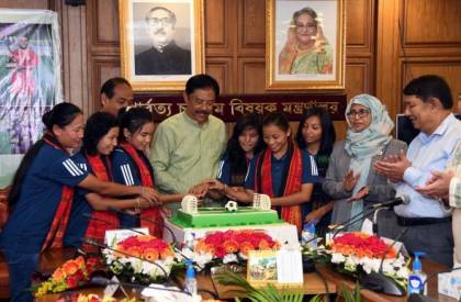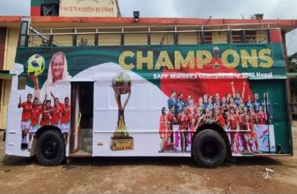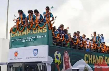প্রসঙ্গত, গত সোমবার কাঠমান্ডু দশরথ রঙ্গশালা স্টেডিয়ামে সাফ ফাইনালে নেপালকে ৩-১ গোলে হারিয়ে প্রথমবার চ্যাম্পিয়ন হয়েছে বাংলাদেশ নারী ফুটবল দল। ট্রফি নিয়ে বুধবার দুপুরে দেশে ফিরেছেন চ্যাম্পিয়ন কন্যারা। গোটা দেশ বরণ করে নিচ্ছে তাদের!